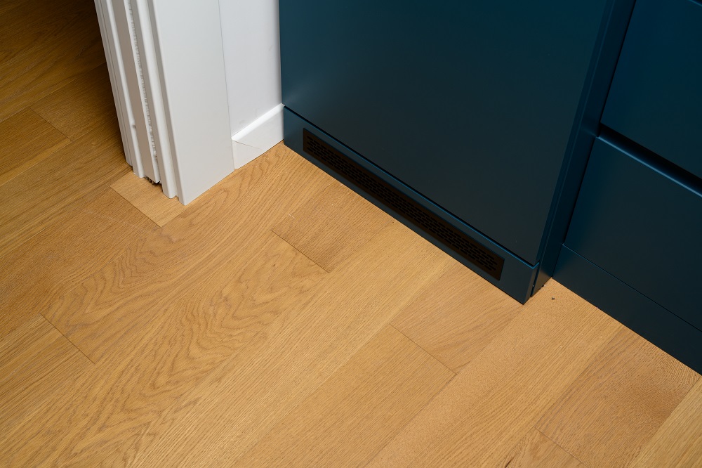 Кухня-гостиная в стиле шестидесятых предполагает полы из натурального дерева, но в новом прочтении: кварцпаркет Quartz Parquet Классик Дуб Медовый Раф 463 не боится ни воды, ни когтей домашних питомцев.